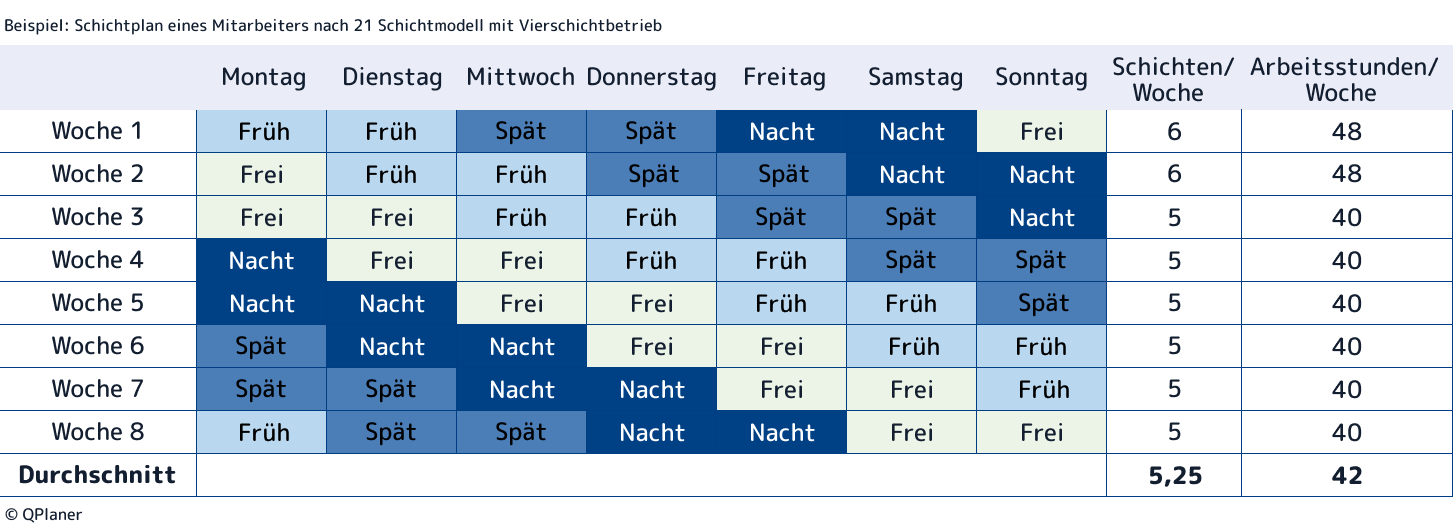 Die 21 Schichten werden von Montag bis Sonntag in jeweils 3 Schichten aufgeteilt (Frühschicht, Spätschicht, Nachtschicht). Somit ergeben sich: